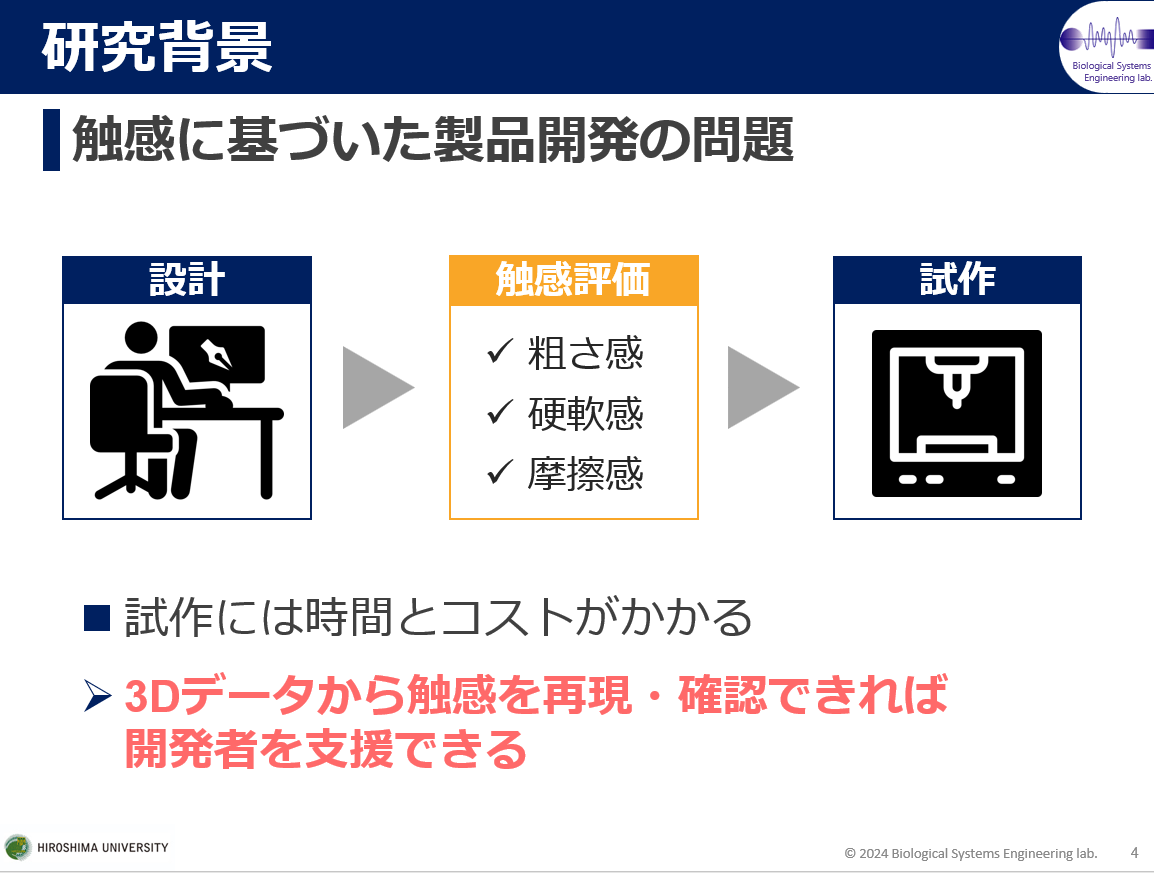 様々な表面形状を再現したサンプルの触り心地が研究により検証されている. ハイトマップ画像特徴量と対象者属性情報に基づく表面テクスチャの触感推定, という研究では金型に材料を流しこむことで触感サンプルを作成している. この方法は高い精度で触感サンプルを作成することができる. しかし目的の形状を作る際, 金型を作りそこからサンプルを作成する必要があるため,コストと時間がかかるという問題がある. そこで3D プリンタを用いれば目的の形状を素早く低コストで造形できると考える.3D プリンタで作成した触感サンプルは金型で作った触感サンプルと比べて精度が低くなってしまうというデメリットがあるが, 触り心地に差がなければこの問題を解決でき, 触感サンプルの造形において3D プリンタが非常に有用であるといえる.そこで,本研究ではハイトマップから3D プリンタならびに金型で作成した3D テクスチャの触感の検討を目的とする.